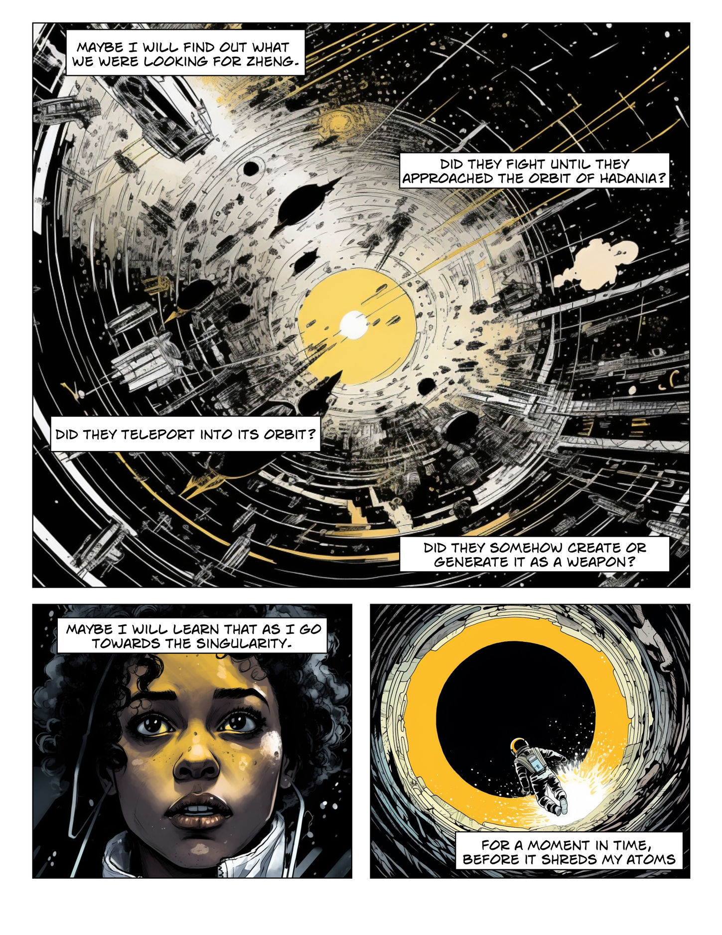 A Researcher and her colleague back home search for knowledge and meaning next to a massive space battle on the rim of a black hole.